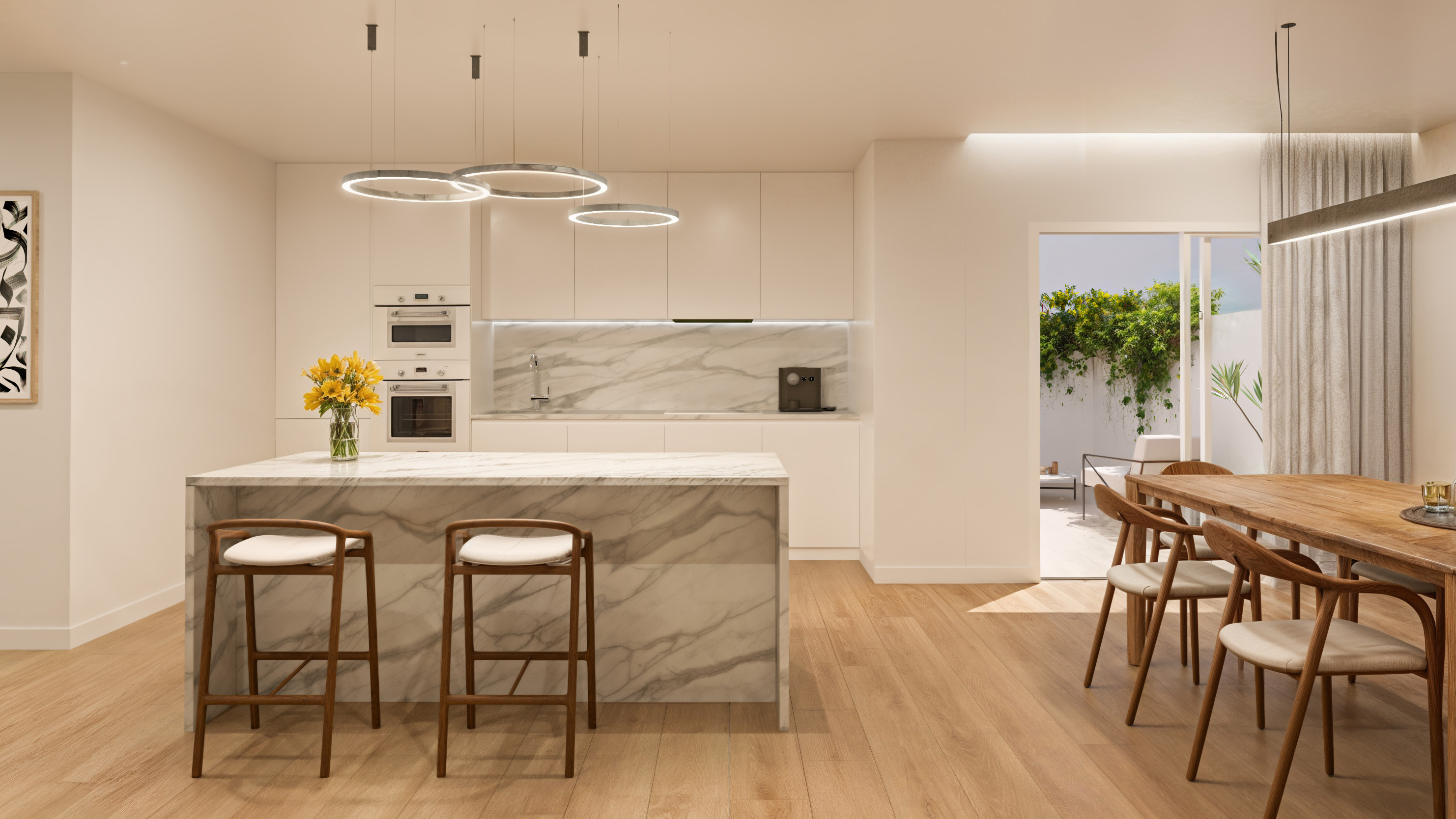 Das Projekt umfasst 75 Wohnungen mit einem bis vier Schlafzimmern , die sich auf vier Etagen verteilen. Alle Wohnungen verfügen über einen privaten Parkplatz und einen Außenbereich, der durch zwei große gemeinschaftliche Innenhöfe ergänzt wird, die als wahre Refugien des Lichts und der Ruhe dienen. Die voll ausgestatteten Küchen, die Klimaanlage und die thermisch getrennten Fensterrahmen garantieren ein hohes Maß an Komfort und Energieeinsparung.