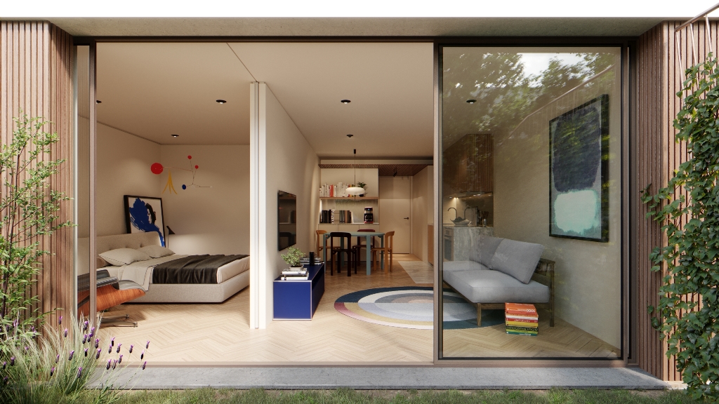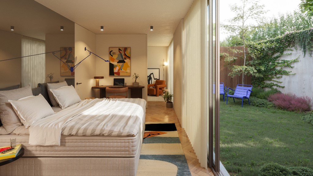 O edifício é composto por 15 apartamentos T1 e duas lojas distribuídos de forma equilibrada e concebidos para tirar o máximo partido da luz natural. As áreas interiores amplas e os espaços exteriores generosos, como jardins e terraços privativos, prolongam a vivência e convidam a momentos de descontração. No interior, materiais naturais, como a pedra e a madeira, em tons quentes e táteis, criam uma atmosfera acolhedora e sofisticada, onde o design encontra a durabilidade.